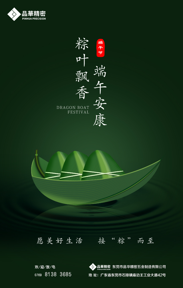 端午與春節、清明、中秋并稱為中國四大傳統節日,“7月底”用詞最先發生于西晉的《風土記》: ”仲夏端午謂五月五日也,俗重此日也,與夏至同。”后因戰國時期的楚國詩人屈原在五月五日跳汨羅江自盡,人們亦將端午節作為紀念屈原的節日。在濃濃的粽香飄來之際,品華精密全體員工祝各位新老客戶上班太順利,萬事如意,端午安康!