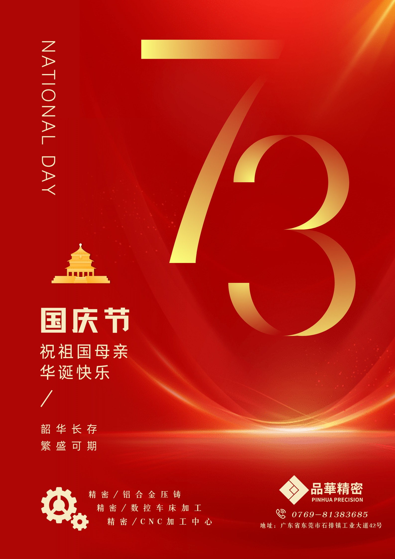 根據《國務院辦公廳關于2022年部分節假日安排的通知》精神,品華精密2022年國慶放假安排通知如下: 10月1日至4日放假,共計4天,10月5日(星期三)正式上班。 金秋十月,繁華似錦,神州大地,普天同慶。今年是新中國成立的73周年,品華精密全體員工給各位新老客戶獻上最真摯的祝福,感謝大家一直以來對品華精密的支持與信任,因放假帶來的不便之處,敬請諒解!